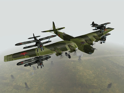 Herewith an artists rendition of a Tb-3 carrying four I-4 fighter planes. "By lashing two or more aircraft together, the combined machines can often accomplish things that neither vehicle is capable of on its own."